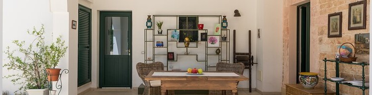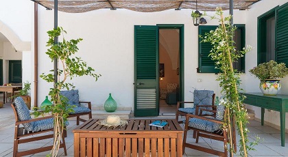 All’ appartamento, che si sviluppa lunga la facciata nord della masseria, si accede da un ampio porticato di pertinenza esclusiva dello stesso. L’appartamento è composto da una ampia cucina, un soggiorno pranzo, una grande stanza da letto con camino e angolo lettura ed un bagno con doccia. Da un lato della cucina vi è un altro spazio esterno, anche questo di pertinenza dell’appartamento. A seconda delle ore del giorno l’appartamento offre sempre zone private in ombra. Nella La stanza da letto c’ è un zona lettura con un un grande camino che nelle giornate piu’ fredde può integrare il calore dei radiatori dell’impianto di riscaldamento