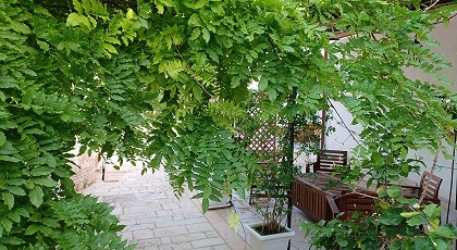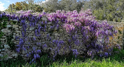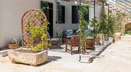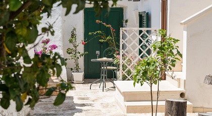 In una zona del giardino, retrostante il trullo, alla quale si accede attraverso una porta sita nel muro di cinta e nascosta da rami di un glicine, ci sono rose rampicanti che riempiono la intera parete, ulivi ed alberi da frutta, fra questi un grande albero di fico che in estate regala agli ospiti frutti dolcissimi.