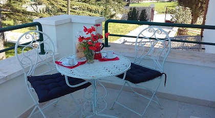 E’ composto da un soggiorno - pranzo con angolo cottura, da una bella stanza da lettoche ha conservato la volta affrescata ed è arredata con mobili d’epoca. Completano l’appartamento una stanza da bagno con moderni sanitari e doccia. L’appartamento affaccia sul porticato e su uno spazio esterno di pertinenza, arredato con poltrone e tavolo da pranzo. E’ coperto da canne di bambu, sulle quali gelsomini e glicine hanno esteso i loro rami. Il pergolato è esposto a nord e garantisce ombra e fresco oltre al contatto diretto col giardino.